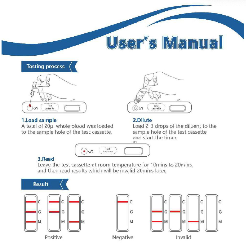 COVID-19/ SARS-CoV-2 (Corona Virus Disease) is an infectious disease caused by the most recently discovered coronavirus. COVID-19/ SARS-CoV-2IgG/IgM Rapid Test (Serum/Plasma/Whole Blood) is a rapid chromatographic immunoassay for the qualitative of IgG and IgM antibodies to COVID-19 in human serum, plasma or whole blood. Advantages of the product 1) Early discovery: positive IgM indicate early phase of infection 2) Whole spectrum: cover early, mid and late phase of disease, avoid missing 3) Efficiency: one test contain specific IgM and IgG antibodies, don’t need any other equipment, and the result can be read in ten mins. 4)Safety: Individual test avoid cross-infection.